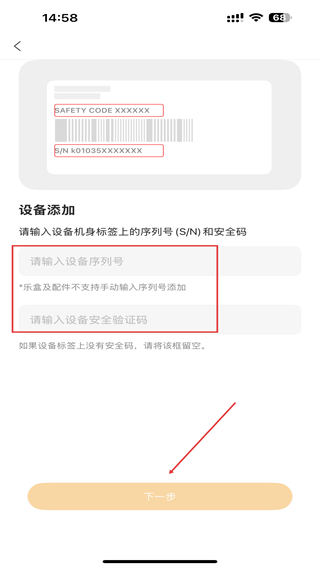 4、输入设备机身的序列号和安全码,确认信息后点击下一步,完成设备添加。