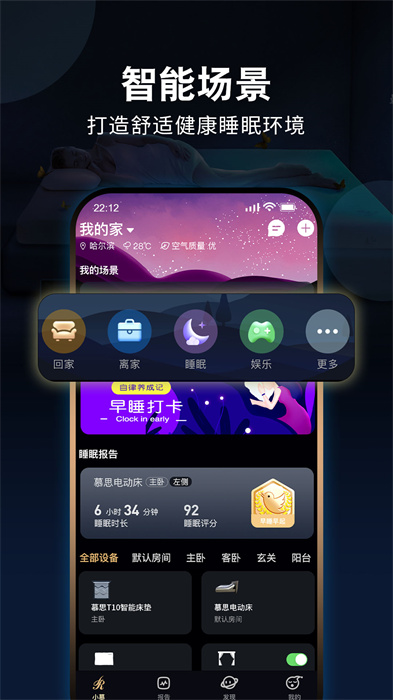 智慧慕思,慕思集团旗下智能家居APP,集智能家居家电管理、睡眠监测、睡眠知识科普、睡眠改善、助眠放松、寝具定制功能为一体的智能家居平台。