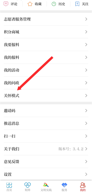 2、在个人的页面,找到并点击关怀模式选项,弹出开启确认提示。