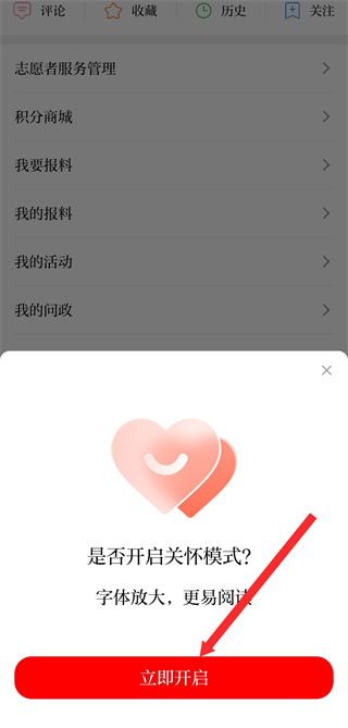 3、在系统的提示框中,点击立即开启按钮,启动关怀模式。