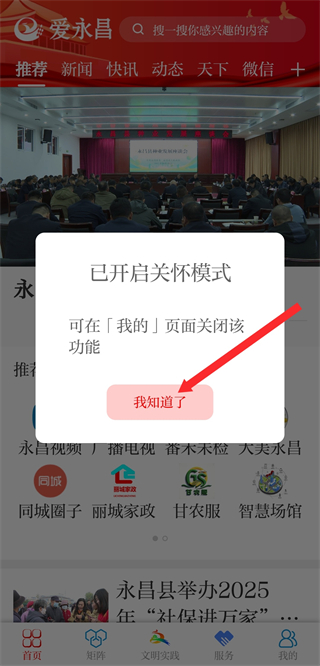 4、待页面弹出已开启关怀模式的提示后,点击我知道了完成设置。