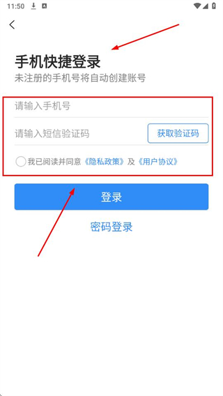 2、选择手机快捷登录,输入手机号,填入验证码,勾选协议后点击登录。