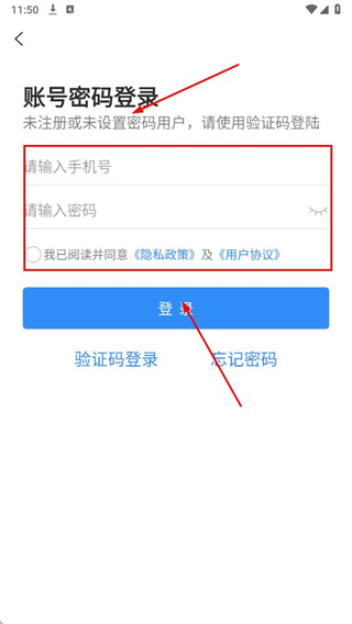 3、选择账号密码登录,输入手机号和密码,勾选协议后点击登录。