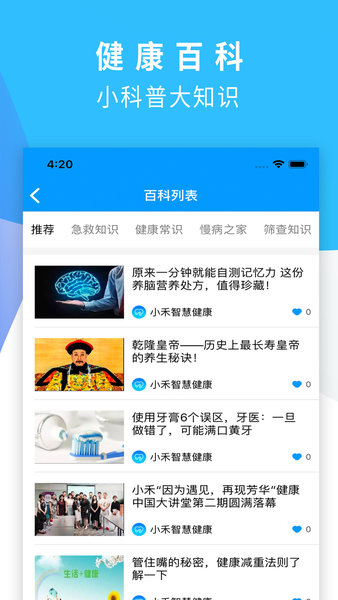 小禾智慧是一款帮助您了解健康生活的医疗资讯app,全国多家三甲医院在线问诊,全面了解您的身体健康状况。各类专家入驻,让您获得最便捷的服务。线上检测报告拍片等均可上传,了解您的身体健康曲线。每日推送各种健康小知识,了解健康养生内容,帮助您将不良习惯从根源杀死。