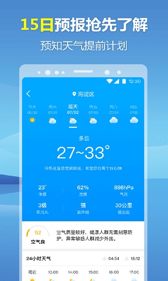 4、精准实时与24小时逐小时天气预报,温度变化冷暖早知道。