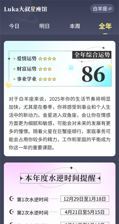 4、点击全年选项还能了解今年综合的运势情况,对当前星座本年的运势进行分析。