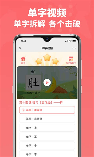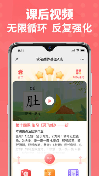 课堂学习忘了么,不用怕。进入班级,在家也可反复观看本课精简视频,掌握书写要点,同时还配套有单字书写示范视频,可以针对单个字反复观看练习。课程视频不仅可以复习,还可以提前预习,让你的成长更进一步。