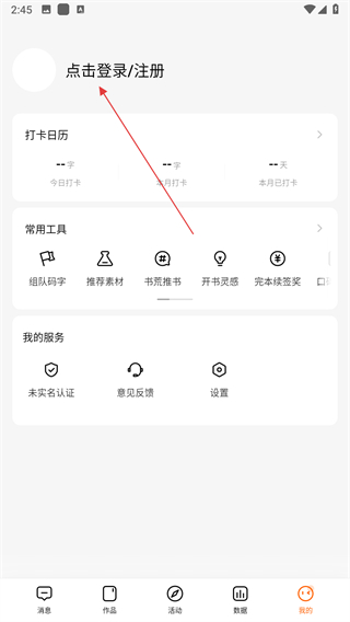 1、打开番茄作家助手APP,进入我的页面,点击点击登录/注册。