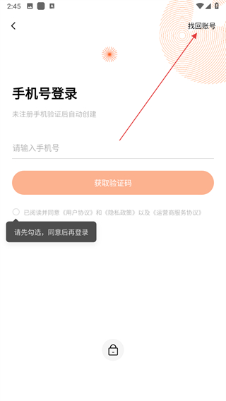 2、在登录界面点击右上角的找回账号选项,进入账号找回页面。