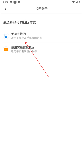 3、选择账号找回方式,点击手机号找回,进入手机验证页面。