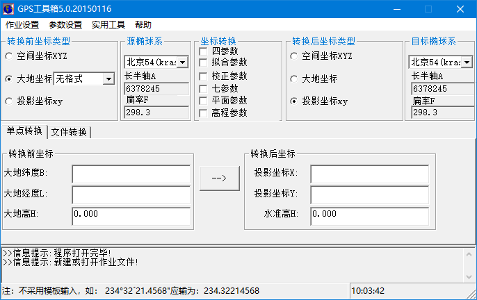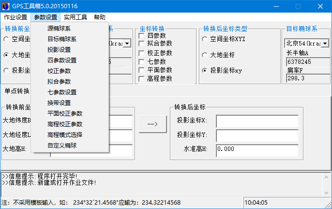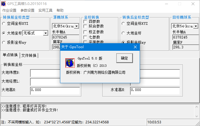 南方Gpstool软件用于生成、读取大地坐标的格式,可转换前坐标类型、转换四参数、拟合参数、校正参数、七参数、平面参数及高程参数,转换后坐标类型(空间坐标XYZ、大地坐标、投影坐标XY)