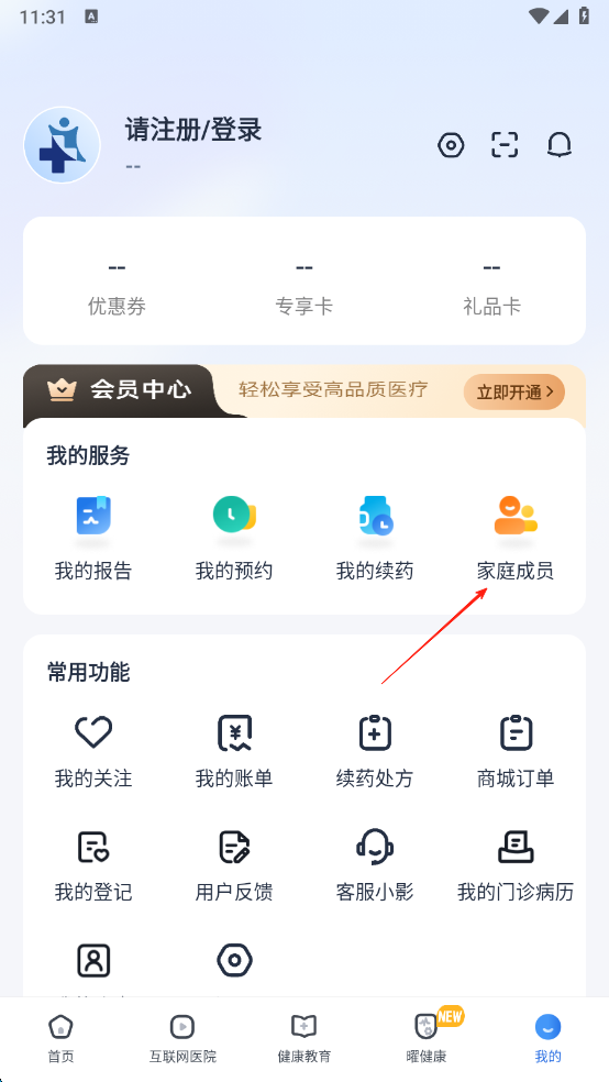 1、打开医疗APP进入首页,找到底部导航栏我的选项点击,跳转页面后在我的服务区域,寻找家庭成员功能入口并点击进入。