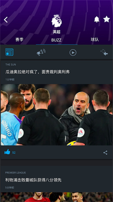 即时比分、突发新闻、社交热点聚合、视频、电视节目表、即将到来的赛程、首发阵容、高级统计数据和转会更新。