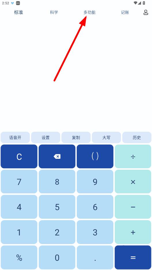1、打开超级计算器,点击上方多功能选项,进入多功能操作界面。