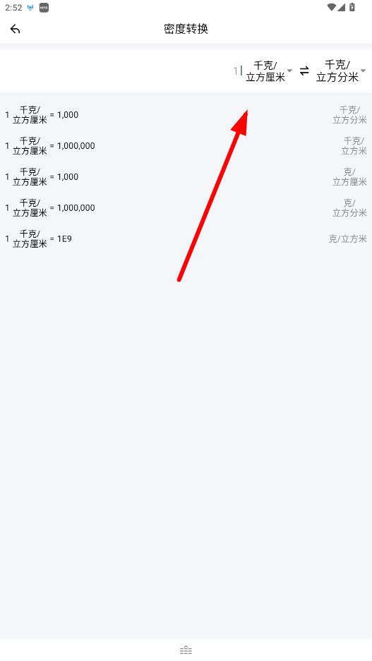 3、在密度转换页面,点击单位选择区域,可选择千克/立方厘米等单位进行转换。