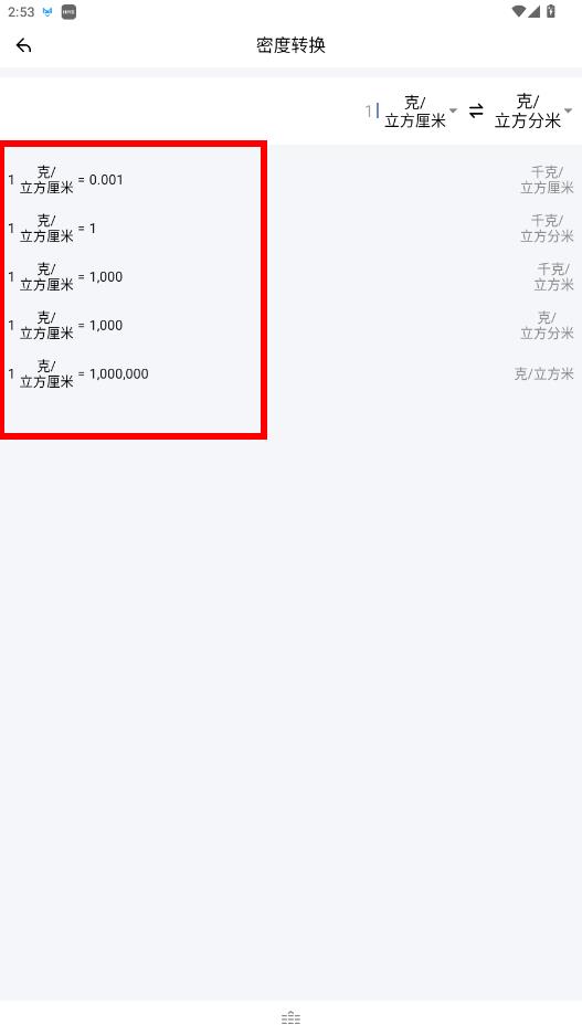 4、选择好单位后,能看到不同单位间的换算关系,比如克/立方厘米与其他单位的换算结果。