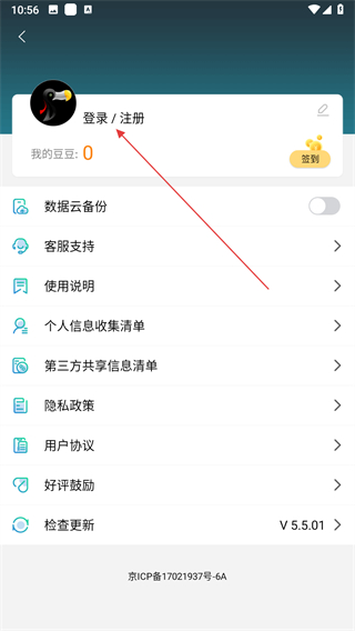 2、在个人页面点击登录/注册选项,进入账号登录页面。