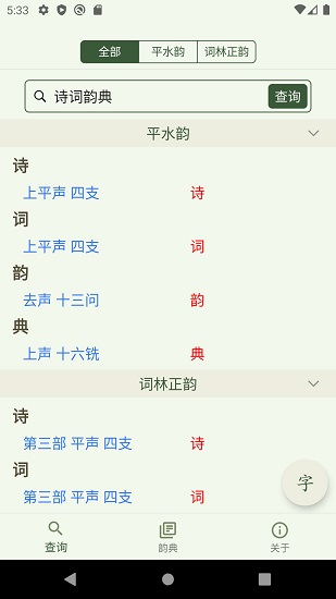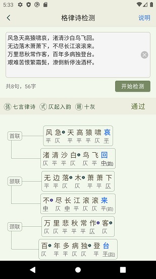1、诗词韵典app可以让用户轻松的进行诗词检测,帮助您检测诗词的押韵情况;