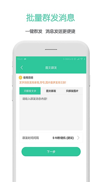 5.一键群发:图片,文字,链接,公众号,小程序一键发所有,无任何限制。