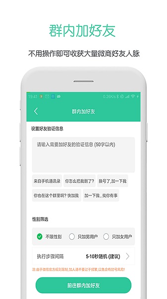 代理微商提供稳定的人脉资源和实用微信营销工具,是一款非常好用的加人加群营销工具软件。