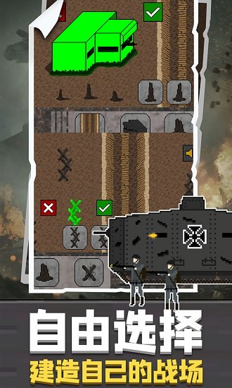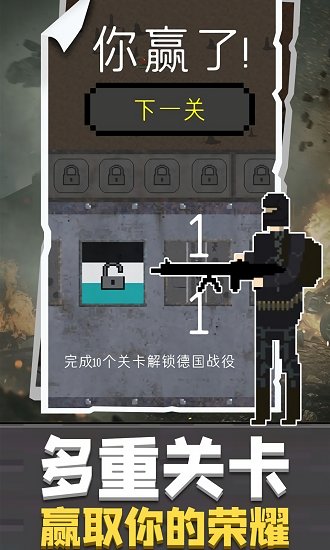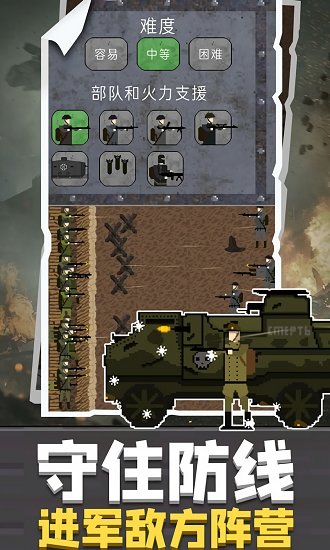 像素风战地狙击游戏,战地荣耀风云游戏中你可以用金币雇佣你想要的士兵,建立你的军队,一路与强大的对手对抗,一步步进军敌营!在战地荣耀风云手游战斗中,请记住您是改过最后的一道防线,你需要不惜一切代价击败敌人,在战地荣耀风云游戏设计你的战争策略,在闯关中解锁新的士兵、坦克、大炮,使敌人屈服吧!
