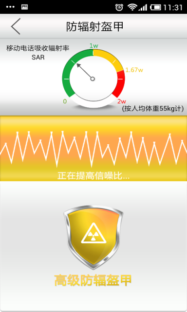 随着手机的普及,手机辐射的问题越来越不容忽视。人们使用手机,接收辐射多少的差异,主观上,主要和通话时间的长短、使用手机的时间长短有关,而使用手机的时间长短一定程度上可以由亮屏时间来判断;而客观上,接收辐射量的多少还和手机信号的强弱以及是否稳定的程度有关。针对这个问题,我们开发了“防辐射盔甲”,通过对“通话时长”的计时,以及对“亮屏时长”的计时,来通过时长显示,使您对自己的辐射接收情况有个清楚的认识,以及“初级降辐射盔甲”和“高级防辐射盔甲”功能,通过稳定接收信号、提高信噪比等措施,来有效降低手机辐射对您的影响,有效保护您的健康。并通过国际公认的辐射计量数据——移动电话吸收辐射率SAR数值来显示,辐射降低,有效看得见