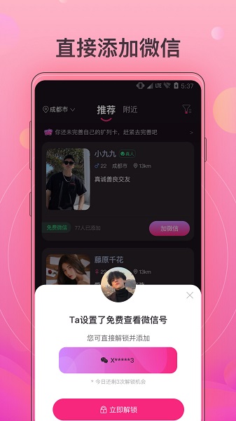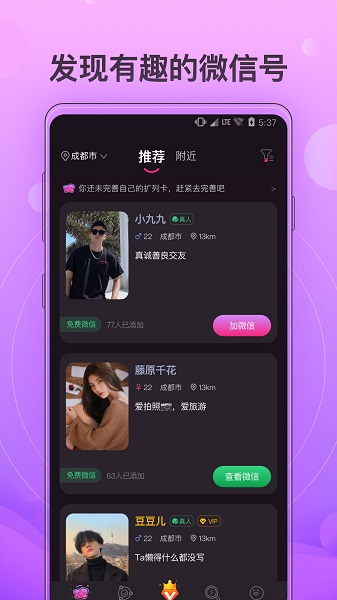 蝴蝶结app帮助您摆脱社交恐惧,只需点开软件,随意寻找您觉得有趣的用户添加微信好友便可开始聊天,每一位用户都经过实名人脸验证,确保真实,各种有趣的宝藏小哥哥小姐姐等您来添加,赶快来下载和他们一起成为朋友吧!