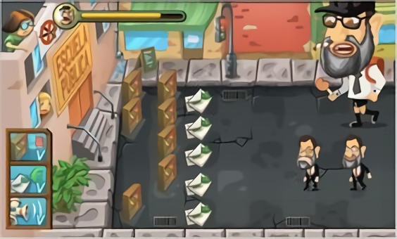 有点类似植物大战僵尸的玩法,在游戏中,只不过这里不需要收集太阳,也是需要等左边的武器亮的时候才可以使用哦,武器亮是需要一个过程的,所以这时候一定要合理安排好,不能让老师们趁机进了学校,你可以使用书架来击退前来的老师,或者是信封,那里面可是有钱的信封哦,老师们看到那些信封,会不顾一切的想要全部拿走哦,利用这点可以拖延下时间,利用书架将他们击退。扩音器的作用可不能小视哦,相当于炸弹哦,等有大批量的老师靠近时,把扩音器放在那里,可以炸死一堆哦,过不了多久,就会出现大BOSS,在BOSS出招的时候点击之即可消耗其血量,4个BOSS等你来挑战。