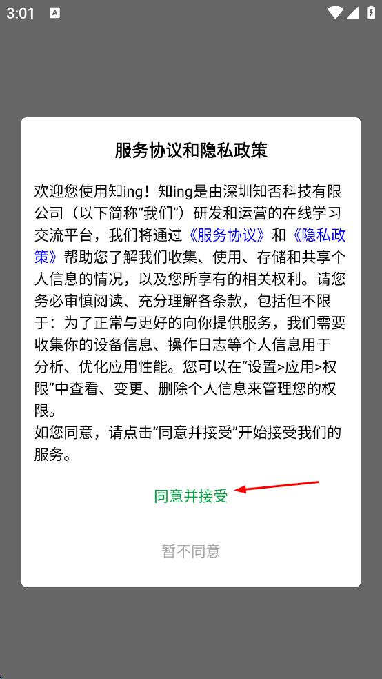 1、打开知ing,会弹出服务协议和隐私政策页面,仔细阅读后点击同意并接受按钮。
