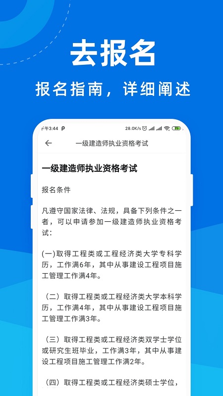 4、优质的报名指南,为你推出详细的报名流程和报名条件,让你可以顺利的报名参加考试;