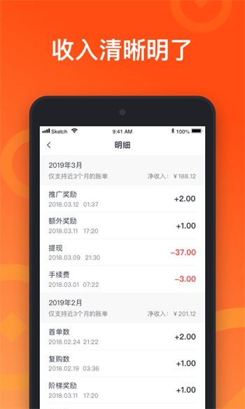 3、收入明细,推广数量,以及获客量,流量等等,一目了然;