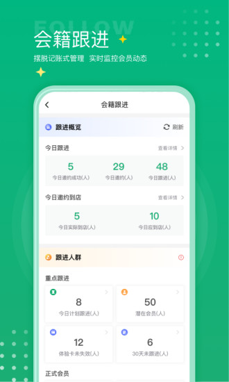 练多多场馆端适合健身房场馆的管理者来使用,可以对会员、教练以及业务进行全方位的管理,有详细的每日每月的经营数据、业绩分析统计,支持对会员进行跟进管理,还支持分层管理,可以制作各种活动海报,欢迎有需要的朋友下载使用!