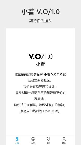 你好,这里是高级时装品牌,小着 VO 的会员空间和社区。喜欢美感和设计,喜欢创造一点新东西的,年轻精英们的聚集地。,我们追求 新型时尚生活 的创新,源自中国有名的全球时尚买手店 HIGO,独家冠名《跑男》第三季,跨界伦敦和北京,已经六年。我们和三位优秀的伦敦设计师,合作设计了这个高级空间,创造和设计一系列。高级时装、香氛、饮品、小课、周边都是「高级质地」的,在这里,就会感到很有「活力」。赞颂「干净利落,热烈进取」的精神,点亮人们热烈的工作和生活。希望,我们一起创造一点新东西,即使不能疯狂改变世界,也能改变一点点世界。小着 VO 等你。THINK SMALL CREATE BIG.