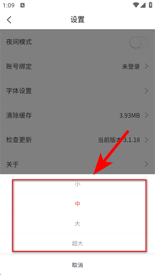 3、在设置的页面,点击字体设置的选项,弹出字号选择框。