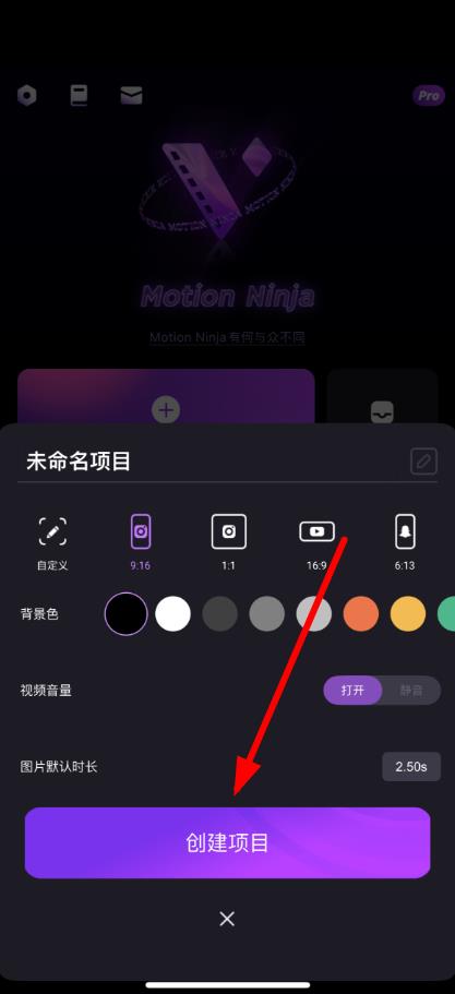 2、在弹出的项目设置界面,选择视频比例、背景色等参数后,点击创建项目。