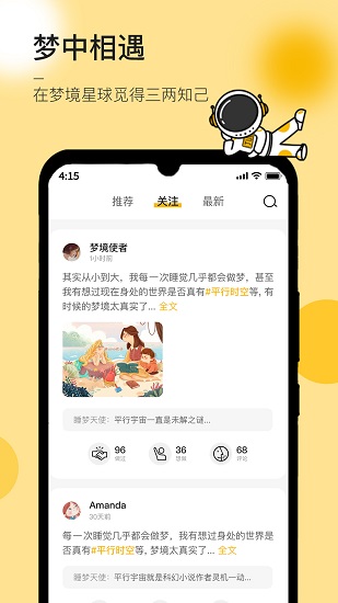 每晚的睡梦是一场梦境之旅,每个人都是星际宇航员。早上醒来,把这旅行做下记录,将梦境故事发布到梦境星球、梦境社区。未来系统会解锁你的潜意识,甚至引导美梦。