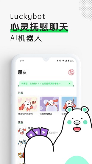 Luckybot助我是一款优质的心灵聊天机器人,可以选择不同的聊天bot,是你贴心的聊天伴侣,好玩有趣的都在这里,让你的生活不会孤单,永远有人陪,空闲时光找到一丝丝的乐趣,如果你感到无聊,那么就告诉他,找他倾诉,释放自己内心的压力。系统提供的个性化评估和建议,不仅能让用户更清晰地认识自己,还能帮助其更好地选择和规划未来的道路,借助科技的力量,我们可以轻松地与他人分享内心的秘密与烦恼,找到生活的小确幸。感兴趣的朋友快来下载吧!