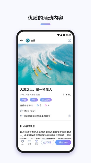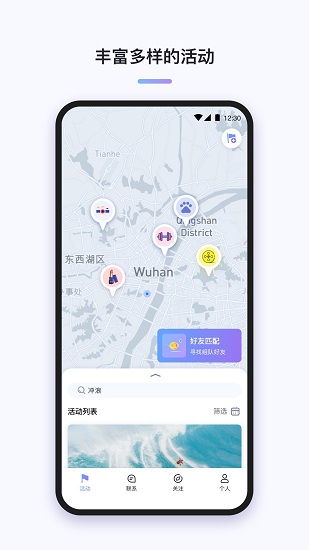 使用”好友匹配“功能,发现更多更潮的活动达人,与他们一起线上沟通,线下畅玩吧