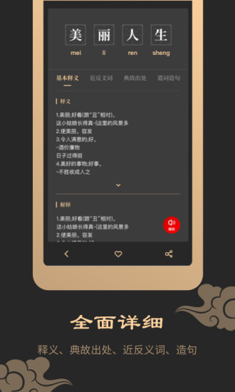 3.包含了发音、释义、出处、示例、近义词、反义词、典故出处等详细内容,方便全面学习