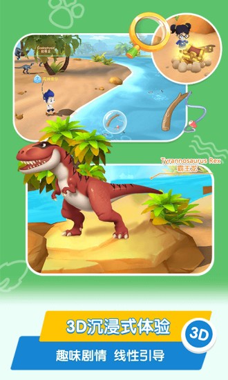 真实场景体验:3D沉浸式场景,身临其境探索恐龙世界,激发孩子的探索欲、求知欲。