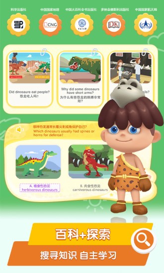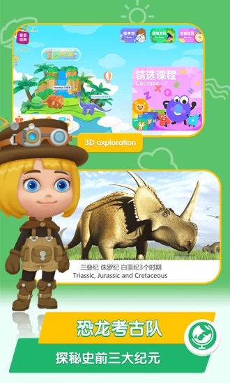 3大课程体系:恐龙大百科、趣味小知识、自然拼读。视频动画加互动游戏提高学习乐趣。
