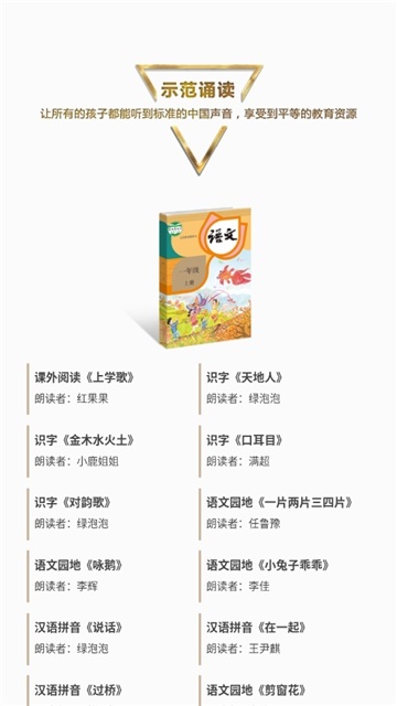 课本课文示范朗诵app是一款专门为中小学生用户打造的语文课本课文朗读软件,用户朋友们可以通过这款软件学习朗读,这款学习软件的功能还是挺实用的,小朋友们跟不上的话可以自行放慢一点,反复练习就会有效果。这款课本课文示范朗诵app上的读者都是通过普通话考试达到一甲水平的哦。