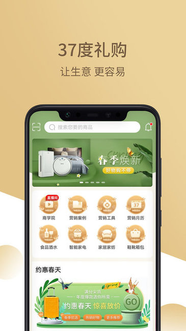 37度礼购app涵盖各种类型的商品礼品购买批发,是实用性很强的互联网营销辅助工具,清晰的页面设计方便大家进行各种商品的选购,品质有保障用起来更加放心,随时随地都可以进行在线选购!