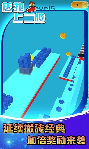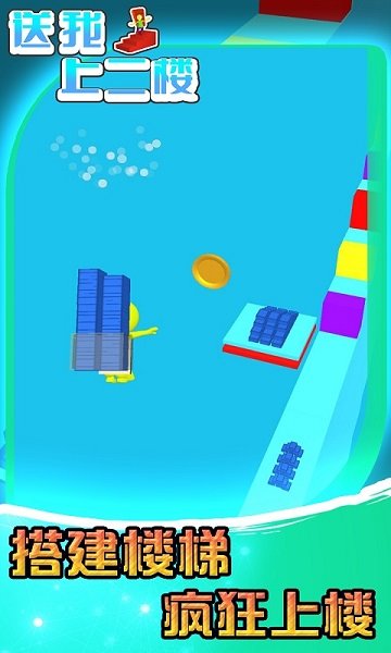 送我上二楼敏捷的闯关休闲手游,游戏中玩家将去收集众多的砖块,需要注意的是砖块的颜色有着多种,小人的颜色也是变换的,只能去收集与小人颜色一样的砖块,如果碰到其他颜色的方块会消减已收集到的方块的数量。