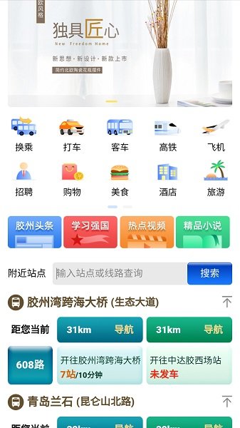 软件首页增设胶州头条以及学习强国栏目,方便用户及时关注胶州最新要闻。首页还能自动根据定位提取离你最近的胶州公交站点信息,无需繁琐功能,一键轻松查阅公交实时状态,方便用户出行。