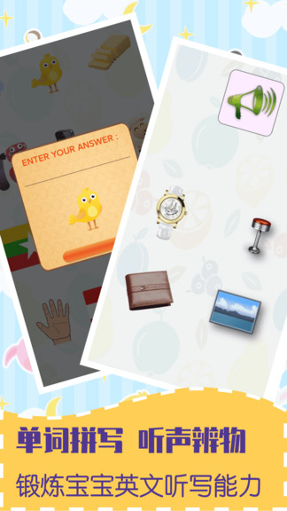 专为宝宝设计的英语启蒙教程,可以让宝宝更早的开始接触英语,对于以后的英文学习大有帮助,我们的app是一款娱乐和学习结合的教育类app,你可以边学习边娱乐,不知不觉中你就学会了不少英文单词。