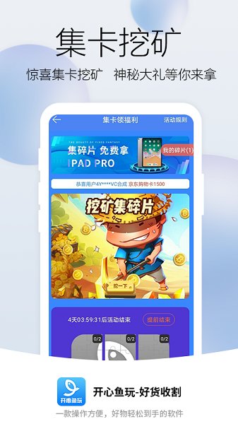 开心鱼玩软件非常的实用的游戏福利盒子,丰富的活动特色的集卡挖矿让你赚钱金币兑换丰富的好礼,挖矿或许直接给你开出好礼,特色的商城优惠给你丰富的好礼,活动多多奖励多多有需要的用户就来下载试试吧!