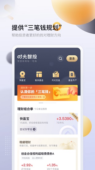时光智投是围绕基金理财方面打造的一款金融类app,在这里给用户提供最好的理财服务和最广泛的选择,这里有最专业的团队为用户制定最合适的理财方案,时刻关注市场趋势,让用户安全理财,放心理财。