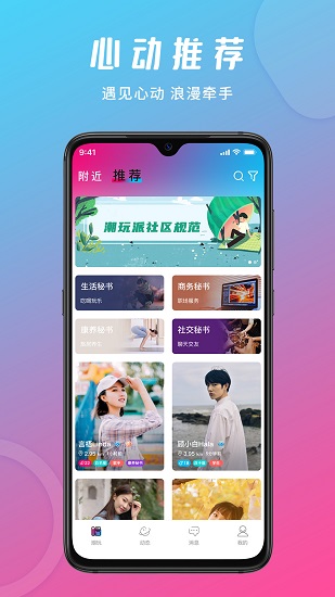 潮玩派一款社交聊天软件,用户可以在里面随意的和其他人打招呼聊天。还可以设置自己的喜好有ai智能匹配好友聊天。平台用户都是实名制安全可靠。每天除去聊天还可以分享自己每日心情到社区中。每天都会推荐位在主页碰见心动的就快去联系他吧。想要脱单的朋友可以来下载。
