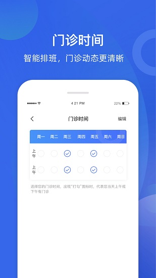 门诊排班设置、临时通告推送,方便患者了解医生动态;